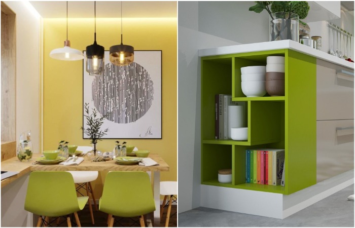 Привычный интерьер сразу будет выглядеть по-другому, если вы добавите несколько ярких акцентов. Выделите цветом стеллаж, открытые полки или несколько плиток на полу. Можно пойти еще дальше и сделать акцентную стену в обеденной зоне. Так вы не только добавите ярких ноток в интерьер, но также визуально разделите кухню на несколько частей.
