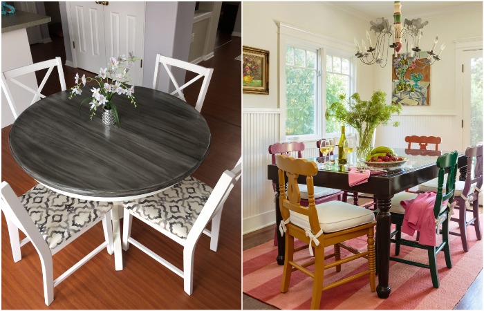 Если на кухне присутствует еще старая советская мебель, не торопитесь ее выбрасывать. Для начала попробуйте отшлифовать и перекрасить – возможно, после такой трансформации стол и стулья лучше впишутся в интерьер. Можно использовать одну краску, а можно поэкспериментировать – для стола выбрать нейтральный цвет, а для стульев – контрастный или комплиментарный. Отлично, если выбранные оттенки будут повторяться в кухонном текстиле, декоре или посуде – своеобразная колор-перекличка.