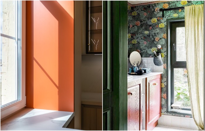 Если вы хотите обновить интерьер и добавить в него цвета, но боитесь окрашивать большие поверхности, у нас есть для вас отличный вариант – используйте яркие оттенки для оформления оконных и дверных откосов. Можно поддержать цвет при помощи напольного плинтуса или кухонной утвари, а можно ограничиться исключительно откосами. Обратите внимание, что этот прием актуален не только для ярких тонов, но также для спокойных нейтральных оттенков. Например, если кухня оформлена в бежевом цвете, откосы могут быть нежно-голубыми или светло-зелеными.