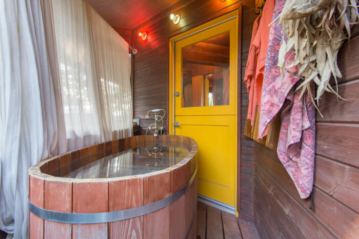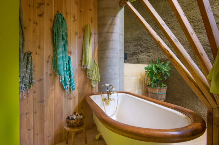 На этом уровне еще предусмотрена и ванная комната с выходом на открытую террасу, где, в дополнение к основному оборудованию, установлены душ и деревянная ванна с видом на сад. Эта часть дома вызывает стойкое ощущение, что находишься в роскошном домике на дереве, ведь половина окружности строения вплотную приближается к фруктовому саду, так что в любой момент, открыв окно, можно угоститься созревшими вишнями или яблоками.
