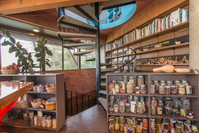 Кухня оформлена в деревенском стиле, а вместо кладовой все съестные запасы хранятся на полках полуоткрытых тумб (Geodesic Dome House, Лос-Анджелес). | Фото: messynessychic.com.
