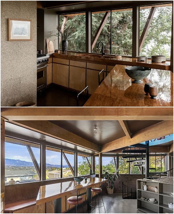 Просторная кухня с захватывающими видами на живописный пейзаж порадует новых владельцев (Geodesic Dome House, Лос-Анджелес).
