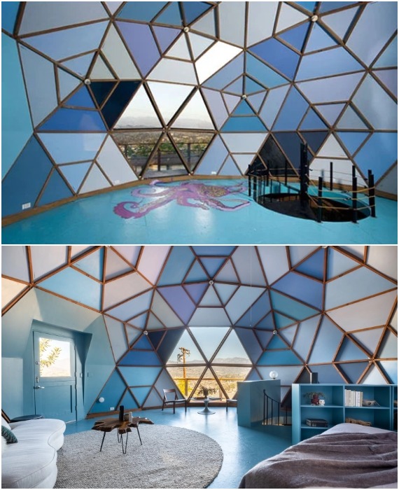 Несмотря на «пещерное» оформление стен и потолка дизайн интерьера может быть и современным (Geodesic Dome House, Лос-Анджелес). | Фото: beyondshelter.com.