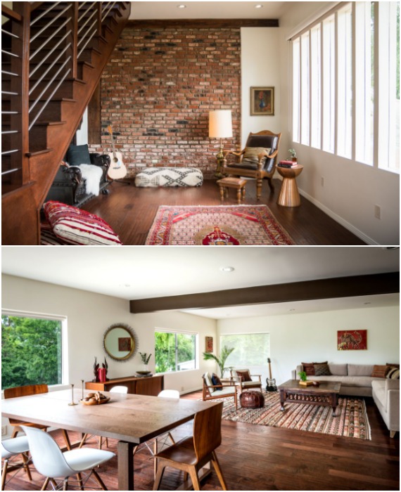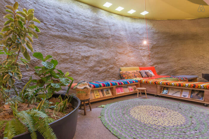 Оформление гостиной в народном стиле, которая находится в подземном этаже (Geodesic Dome House, Лос-Анджелес). | Фото: messynessychic.com.