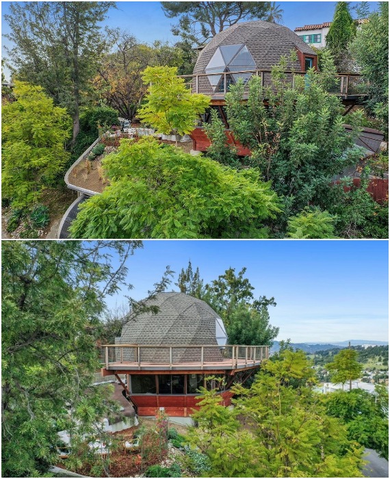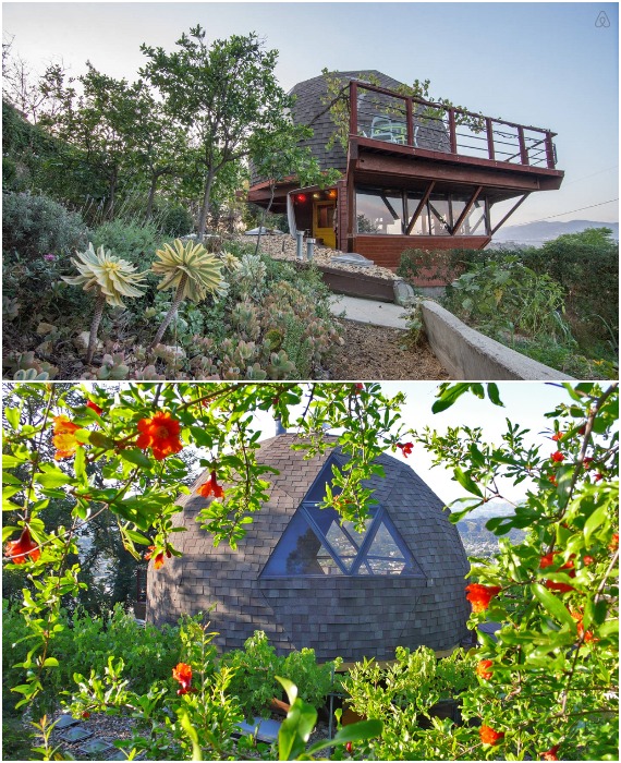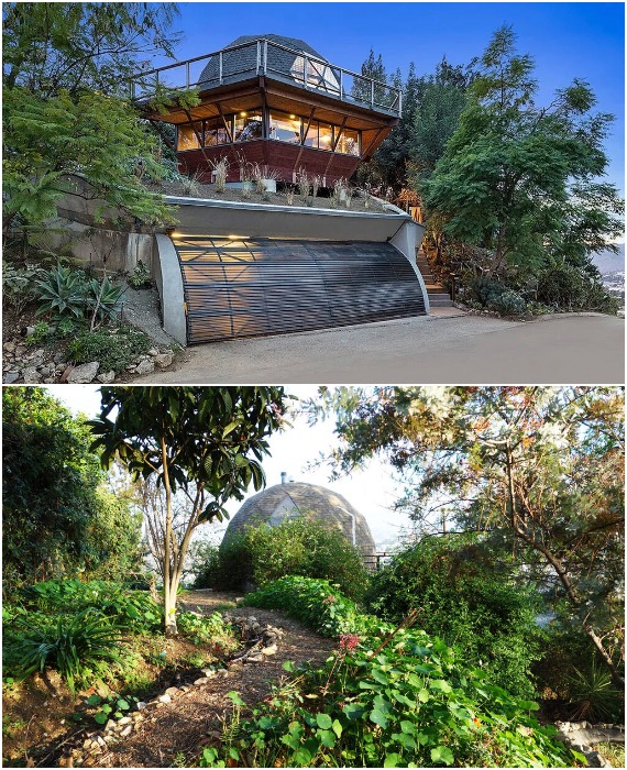 Утопающий в зелени купольный дом, расположен на вершине холма откуда открывается прекрасный вид на Лос-Анджелес и на живописный склон (Geodesic Dome House, США).