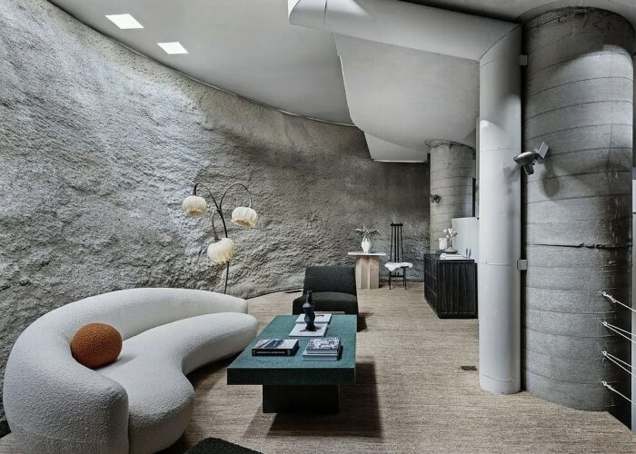 Помимо прихожей здесь оформлена гостиная, интерьеру которой последний владелец придает особенный вид (в зависимости от того, какое настроение или какое мероприятие намечается). Иногда она превращается в старинное аутентичное пространство, а в следующий раз – радует современным шиком, даже несмотря на то, что ее окружают пещерные своды, обтекаемые текучие стены из бетона и камня. Также на нижнем уровне есть небольшая спальня, благоустроенная ванная комната и гардеробная.