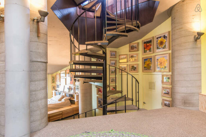 Винтовая лестница является связующим звеном между этажами и полууровнями (Geodesic Dome House, Лос-Анджелес). | Фото: messynessychic.com.