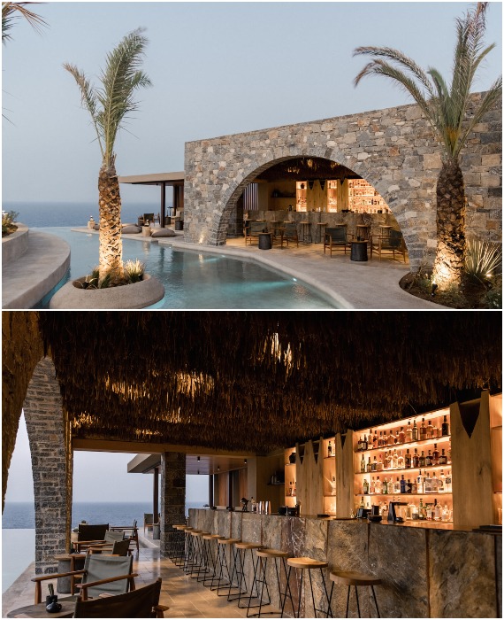 Дизайн ресторана и коктейль-бара соответствует общей концепции оформления курортно-оздоровительного комплекса (Acro Suites, остров Крит).