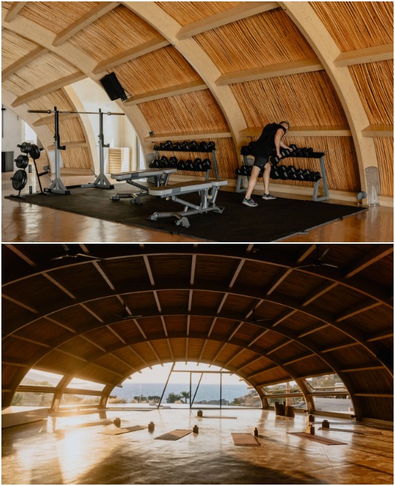 Для активных и целеустремленных гостей курортного комплекса обустроили тренажерный зал и полузакрытый павильон Asana Yoga Shala для достижения равновесия между телом и разумом (Acro Suites, Греция).