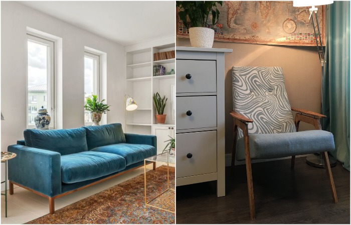 Что касается кресел, то сейчас невероятно популярна модель на тонких ножках. Ее ищут на сайтах объявлений, барахолках, привозят с дачи, а чтобы она дополнила современный интерьер – меняют обивку и переделывают своими руками. Есть даже современные аналоги, которые выпускают мебельные шоу-румы в ответ на высокий спрос клиентов. Если у вас есть такое кресло, даже не думайте от него избавляться – обновите и сделайте изюминкой в спальне или в гостиной.