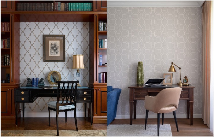 Массивный предмет мебели будет отлично смотреться на фоне обоев с геометрическим узором. Дополните ккомпозицию мягким винтажным креслом, которое сделает рабочее место комфортным и уютным, а на стол поставьте лампу золотистого оттенка.