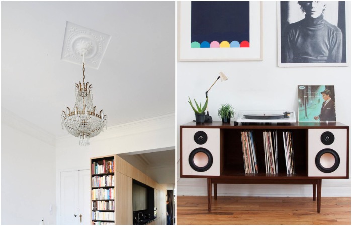 В качестве освещения подойдет хрустальная люстра, в качестве аксессуаров - виниловые пластинки