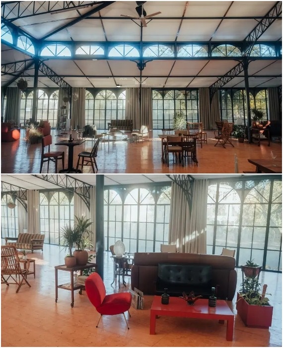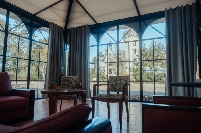 Зона отдыха, в открывшемся павильоне с видом на замок Chateau de la Mothe Chandeniers (коммуна Ле-Труа-Мутье, Франция). | Фото: jaimemonpatrimoine.fr.