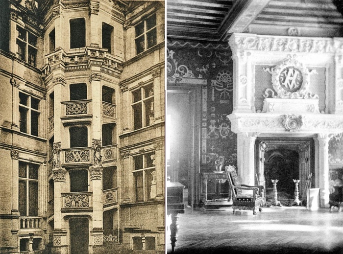 Главная башня и интерьер сказочно красивого и роскошного замка еще до трагических событий, связанных с пожаром (La Mothe-Chandeniers, Франция).