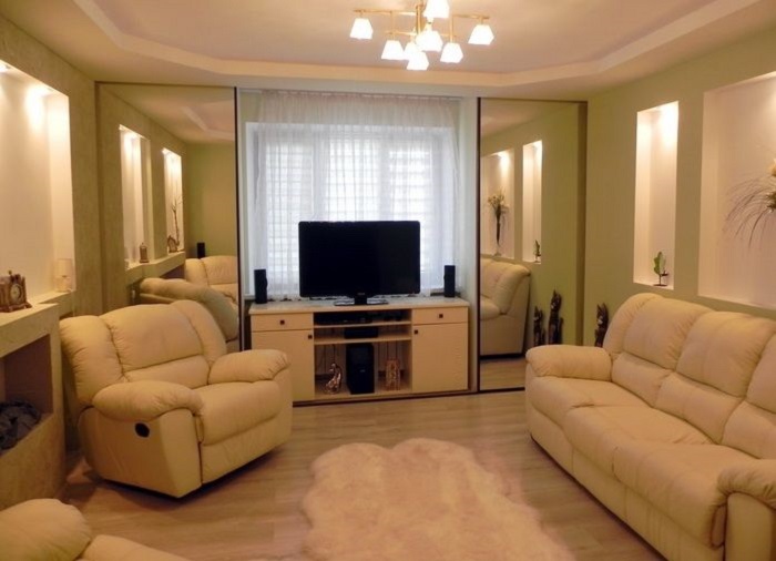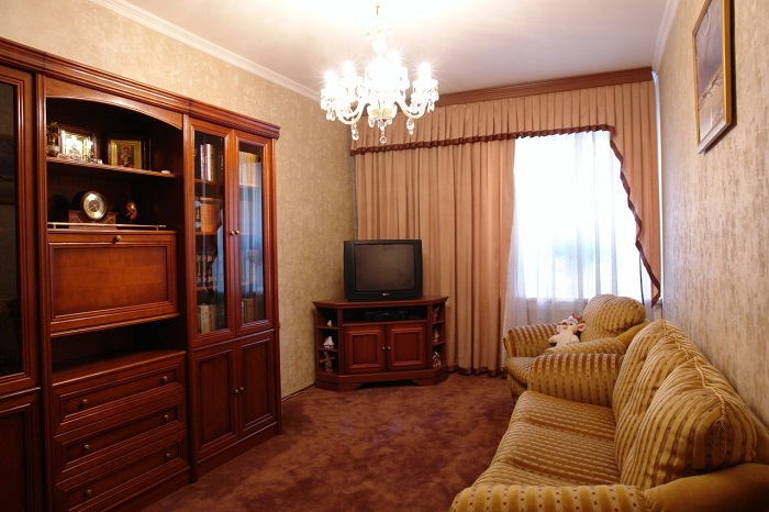 Шкаф, диван и телевизор стоят возле стен. / Фото: hameleone.ru