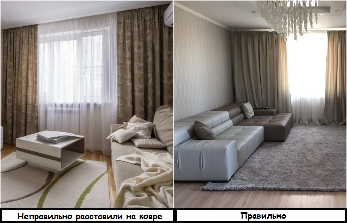 Существует три правила грамотной расстановки мебели на ковре. Выбирайте один из них, чтобы не нарушать пропорции комнаты: