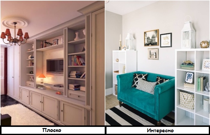Посмотрите на фотографии дизайнерских интерьеров – они редко располагают что-либо стройными рядами, если только речь не идет о кухонном гарнитуре. За большим шкафом они ставят низкий комод, дальше – торшер или высокое комнатное растение в акцентном кашпо. Такой интерьер долго не надоедает и не вызывает желания поскорее сделать ремонт. Его интереснее рассматривать, потому что получается квартира как с обложки модного журнала.