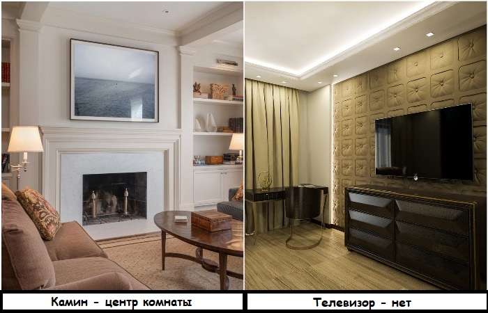 В большинстве случаев, центром комнаты становится телевизор. Однако дизайнеры выступают против такого решения. Если к вам придут гости, придется сидеть возле экрана, а такое месторасположение совсем не способствует приятному разговору. Если же вам очень хочется построить интерьер вокруг телевизора, расположите мягкую мебель не прямо напротив экрана, а полукругом.