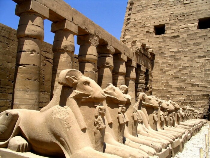 Аллея сфинксов с бараньими головами, в лапах которых можно увидеть небольшую статую Рамзеса II (Karnak Temple, Египет). | Фото: breathemyworld.com.