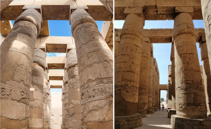 Внутренний двор Храма Хонсу окружен двойными рядами колонн, которые можно считать каменным папирусом, сохранившим часть истории Древнего Египта (Karnak Temple). | Фото: thediscoveriesof.com.