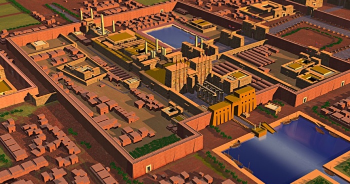 По мнению современных ученых, Карнакский храмовый комплекс имел подобную планировку (визуализация). | Фото: discoveringegypt.com.