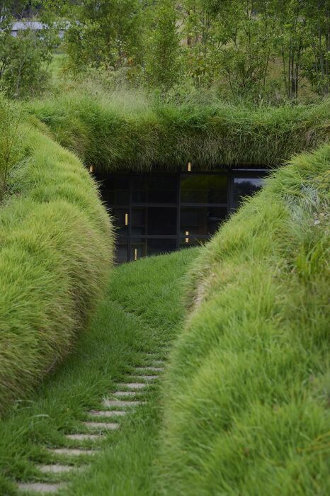 Тропинка среди зеленых холмов приведет к «Подземной библиотеке» (Kurkku Fields, Япония). | Фото: thisiscolossal.com.