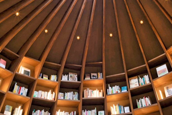 В центре библиотеки находится круглая комната с эффектным деревянным потолком, состоящим из утонченных торцов стеллажей (Kurkku Fields, Япония). | Фото: thisiscolossal.com.