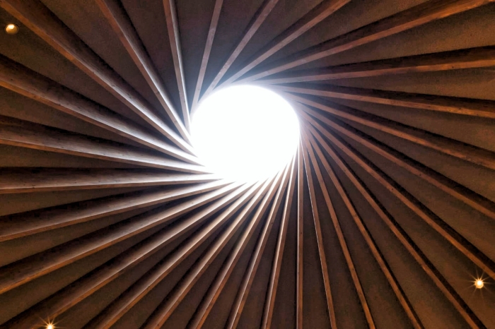 Закручивающиеся к потолку грани, сходятся вокруг круглого потолочного люка, пропускающего солнечный/лунный свет и мерцание звезд (The Underground Library, Япония). | Фото: spoon-tamago.com.