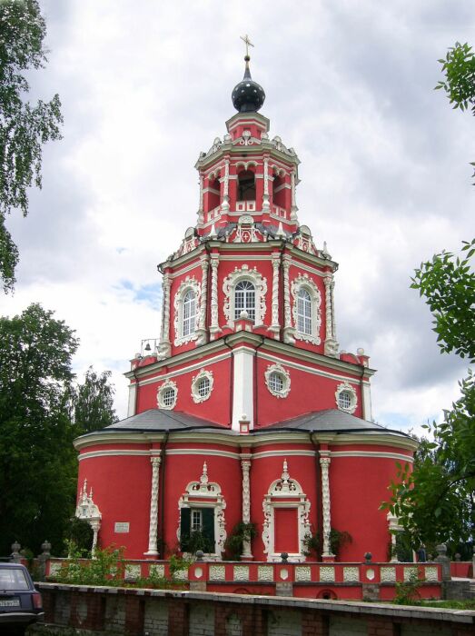 На месте Опричного двора Ивана Грозного, участок земли которого принадлежал семье Нарышкиных, в конце 1680-х годов Лев Кириллович решил построить особенную церковь, в подсмотренном в Европе стиле. До сих пор не удалось определить, кто же был архитектором, но то, что храм получился шедевральным, с этим никто не спорит. В последствии, его форму и оформление будут копировать в других проектах, поэтому эту церковь считают образцом раннего нарышкинского барокко. Знаменская церковь – один из ранних и лучших памятников «нарышкинского барокко», хотя в ней сохраняется традиционный тип вотчинных храмов, возводимых для своей семьи в загородных имениях самих Нарышкиных и приближенных Петра Великого. • Церковь Покрова Пресвятой Богородицы в Филях