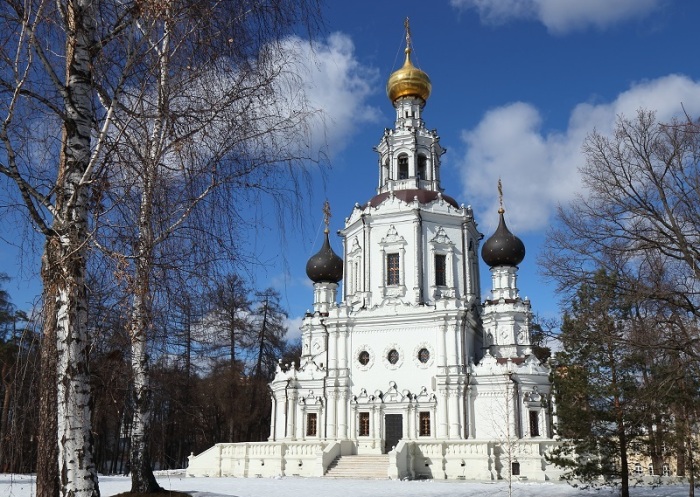 Не только Лев Кириллович строил церкви в своих имениях в новом стиле, его брат Мартемьян Нарышкин обзавелся собственным храмом в своем имении Троице-Лыково. Это была нереальной красоты белоснежная церковь в честь Живоначальной Троицы. Строительство велось в конце XVII века по образу и подобию церкви Покрова в Филях, только здесь отсутствует традиционное для русских храмов того периода двухцветье и, установлена одна глава с ажурным крестом. Еще на фасаде церкви особо привлекательно выглядят витые колонки, сложные резные карнизы, наличники с позолоченными скульптурными узорами. Внутри же можно увидеть двойные хоры с отдельным царским местом, похожим на большой резной фонарь, увенчанный короной, а все потому, что Нарышкин надеялся на посещение Петра I, который заложил первый камень в ее фундамент.