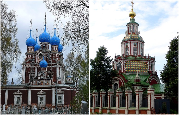 Пример строгановского и петровского барокко (Храм Казанской иконы Божией Матери в Устюжне и Церковь Иоанна Воина на Якиманке).