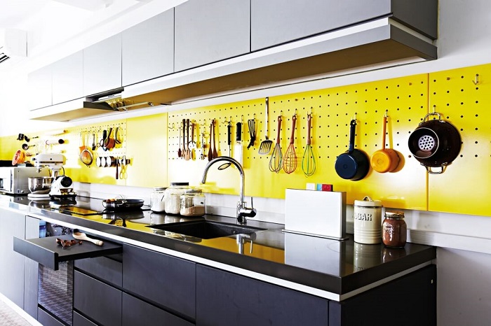 Обычно такая металлическая панель висит в гараже – на ней удобно хранить инструменты. Но можно адаптировать ее и для кухни, используя одновременно и как кухонный фартук, и как органайзер для различной утвари. В отверстия нужно продеть необходимое количество крючков и развесить инвентарь, который должен быть под рукой. Получится и практично, и декоративно, ведь перфорированная панель визуально напоминает какой-нибудь арт-объект. При желании можете покрасить изделие в тон стены, чтобы она сливалась с окружающим пространством, а для декора использовать яркую цветную посуду.