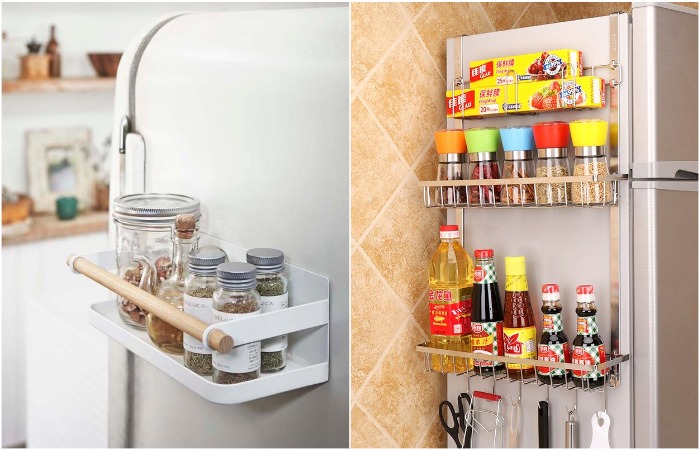 Холодильник можно использовать не только для хранения продуктов. Его боковые стенки являются прекрасным местом для размещения магнитных полок, на которых можно хранить небольшие баночки со специями, прищепки, канцелярские зажимы и пр. А вот крупную посуду лучше держать в другом месте, так как подобные полочки не предназначены для большого веса.