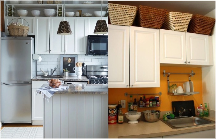 Если между потолком и шкафчиками либо холодильником есть свободное пространство, обязательно используйте его для своих целей. Для удобства можно поставить коробки или плетеные корзинки из ротанга, бересты и других материалов. Они устойчивы к влаге и прекрасно вписываются в большинство современных стилей, а потому будут выполнять роль не только функционального, но и декоративного предмета. Храните наверху сменный текстиль, праздничную посуду, запасные кухонные принадлежности и прочие вещи, которые не нужны вам каждый день.
