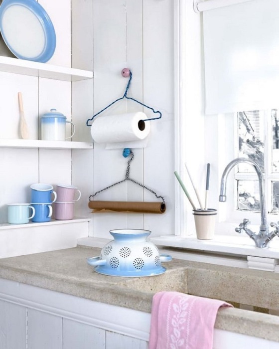 Наверное, вы удивитесь, но для организации хранения на кухне можно использовать даже вешалки. На старых плечиках получится разместить бумажные полотенца, фольгу, бумагу для выпечки – благодаря такой хитрости вы освободите место в ящике, которое в дальнейшем можно будет использовать для хранения посуды, продуктов или других принадлежностей. К тому же, так вам будет гораздо удобнее использовать эти мелочи в процессе готовки – просто отмотайте кусок, нужный по размеру, и оторвите его.
