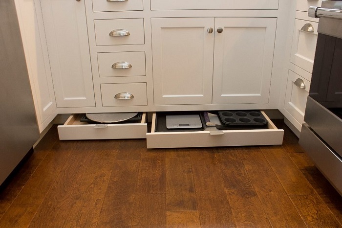 Эффективным решением для кухни станет хранение в цокольном ящике, который располагается под модулями, у самого пола. Обычно он устанавливается вместо традиционной декоративной планки, которая закрывает ножки кухонного гарнитура. Обычно глубина ящика не превышает десяти сантиметров, поэтому сложить туда что-то громоздкое не получится. Его главная функция – хранить приспособления для готовки в духовке: решетки, противни, неглубокие формы для выпечки, фольгу, бумагу и пр. Впрочем, есть и более оригинальные варианты – некоторые хозяйки складывают туда различные документы: инструкции к бытовой технике, гарантийные талоны, договора, оплаченные счета.