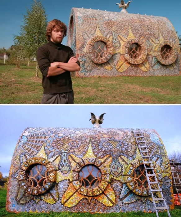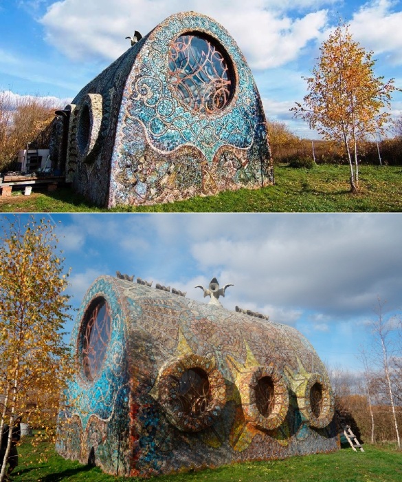 Диковинные мотивы из собственноручно сделанной мозаики превратили загородный дом в причудливый сундук с секретом (Московская область). Другой творец совсем не хочет признавать влияние Антонио Гауди на свое творчество, считая себя уникальным художником и архитектором, но от этого его шедевр не теряет свою привлекательность. Речь идет о мозаичном коттедже с нестандартными формами и дизайном, созданном жителем Московской области, художником Егором Золотаревым, который потратил 2 года жизни на строительство и оформление необычного во всех отношениях загородного дома.