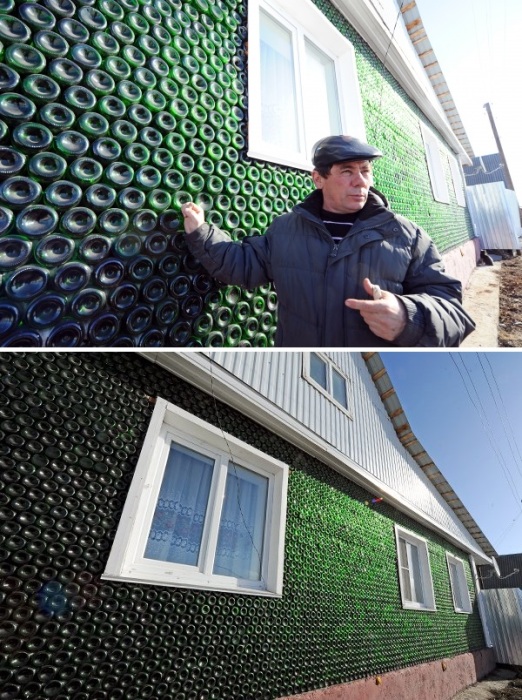 Стекло, сверкающее на солнце разными цветами, давно использовалось в качестве эффектного декора. Но так было раньше, современные же мастеровые люди пошли еще дальше, они начали использовать стеклотару. Используя целые бутылки и укладывая их радами, закрепляя связующим раствором, некоторые оригиналы умудрились построить дачи, просторные жилые дома и даже замки. Кстати сказать, особо предприимчивые хозяева, используют бутылки для украшения и утепления фасадов домов. На Южном Урале, в поселке Теченском, например, Хамидулл Ильчибаев построил дом площадью 99 кв. метров полностью из стеклотары, точнее сказать из бутылок из-под шампанского, чтобы быть наверняка уверенным, то он выдержит любую нагрузку.