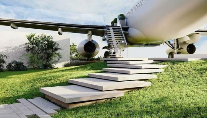 Попасть внутрь преображенного самолета можно будет со стороны крыла (рендеринг Private Jet Villa). | Фото: en.airlinestravel.ro.