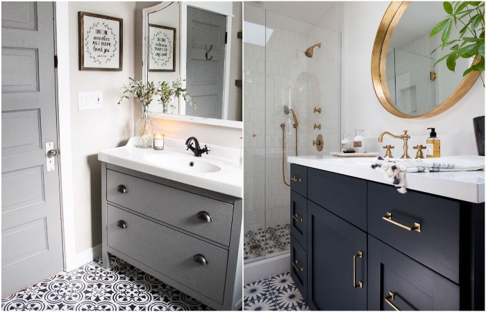 Чтобы изменить настроение всего интерьера, не обязательно перекрашивать стены или менять сантехнику. Иногда достаточно просто заменить старую фурнитуру на что-то броское и необычное. Если в ванной есть тумбы с ящиками или шкафчики, можно просто заменить на них ручки. Идеально смотрится фурнитура под цвет смесителей – так получится создать единую гармоничную композицию. По мнению дизайнеров, самыми универсальными, но в то же время эффектными деталями будут черные, белые и золотистые. Для полноты картины можно также заменить раму зеркала, крючки для полотенец, аксессуары, стоящие на раковине (дозатор, стакан под зубные щетки и пр.)