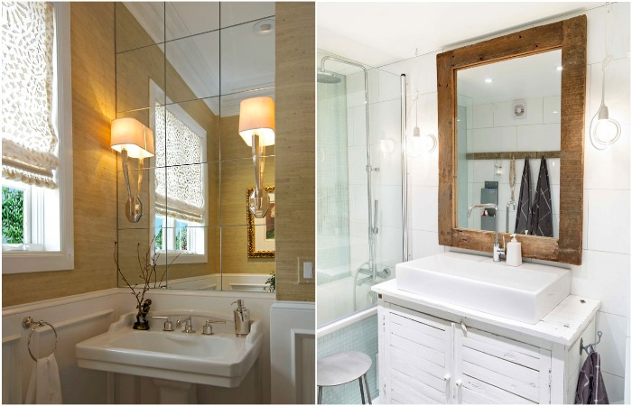 Еще один интересный прием – замена стандартного зеркала на более крупную модель в акцентной раме. А если вы хотите скорректировать пропорции комнаты, визуально сделать ее больше и светлее, можно облицевать зеркальной поверхностью часть стены. Это не только прекрасный способ визуально изменить интерьер, сделать его оригинальнее, добавить дизайнерскую нотку, но и отличная возможность увеличить количество света в помещении, что особенно актуально для темных санузлов.