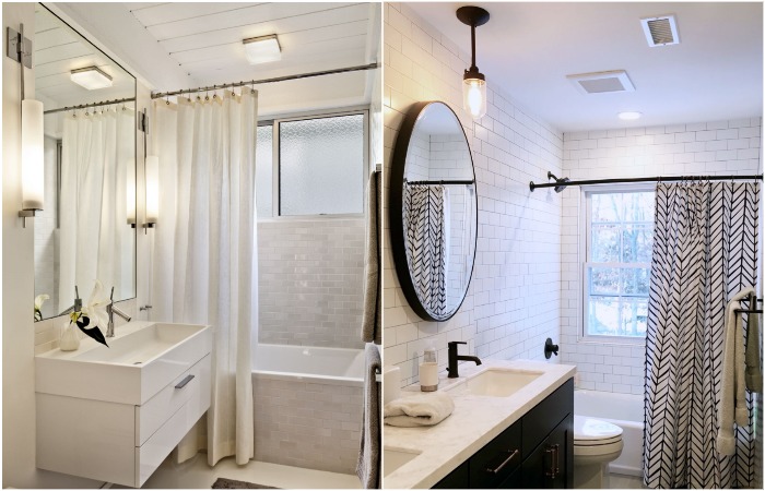 Речь идет не только о коврике и полотенцах, но также о душевой шторке. Этот тот самый момент, когда они крохотный штрих помогает изменить ванную комнату до неузнаваемости. Что может быть проще и бюджетнее? Самое главное – выбрать действительно красивую и стильную занавеску, которая гармонично дополнит интерьер санузла. Откажитесь от штор-клеенок с изображением рыб, цветов, а также изделий с крупными, броскими принтами. Оптимальными будут однотонные варианты или со сдержанным геометрическим узором. Прекрасный лайфхак – повесить две занавески: внутреннюю и внешнюю. Первая будет «соприкасаться» непосредственно с водой, а вторая – находиться на виду. Благодаря такой хитрости вы можете сделать лицевой даже тканевую шторку – они смотрятся в интерьере особенно круто.