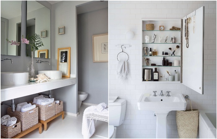 Если не хватает мест для хранения, подумайте о том, чтобы заменить стандартное зеркало шкафчиком с зеркальными дверцами. В нем можно будет спрятать косметику и аксессуары и, тем самым, навести порядок в ванной. Также нелишними будут полки над унитазом, на которые можно будет установить вышеупомянутые плетеные корзины с различными мелочами.