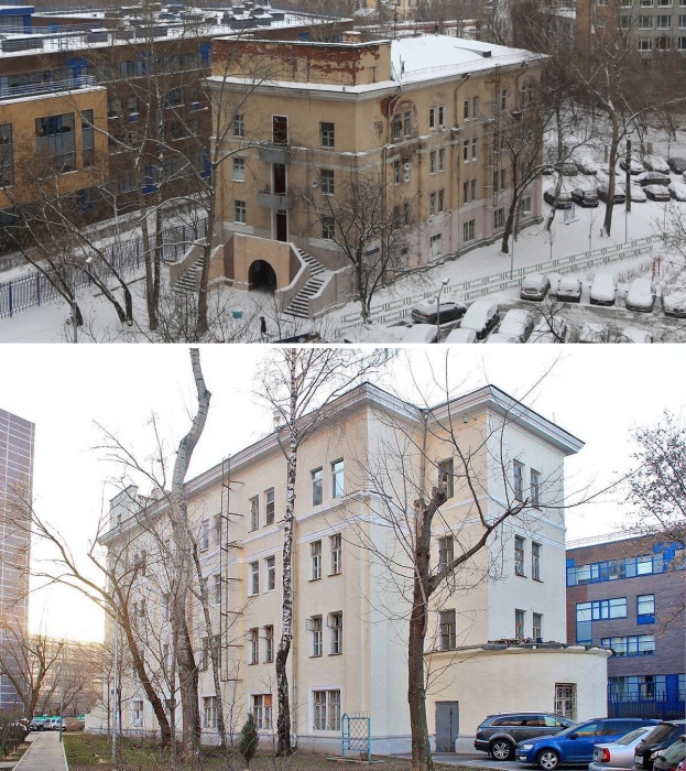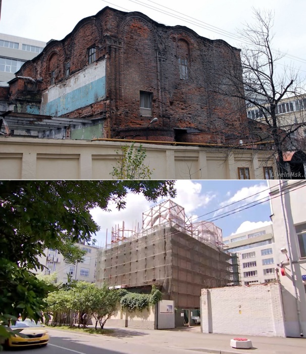 В таком состоянии была колокольня в 1990 году и как она выглядит после реставрации (Храм Рождества Пресвятой Богородицы в Бутырской слободе).