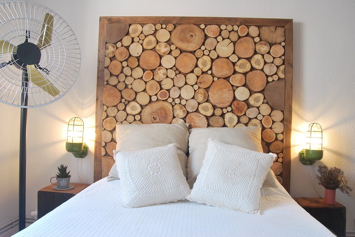 Панно ил спилов дерева в интерьере спальни. / Фото: almode.ru