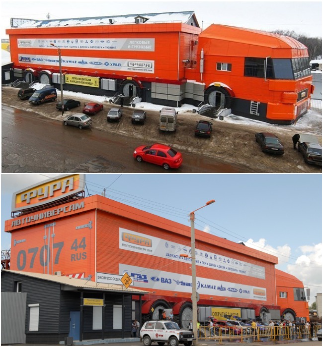 Магазин-фура в Костроме – этот тот случай, когда внешний вид здания просто кричит о своем предназначении. Не нужно быть знатоком архитекторы, чтобы не догадаться, что в этом здании получится найти механизмы, детали и аксессуары, связанные с автомобилями. Костромской автоуниверсам, внесенный в Книгу рекордов Гиннесса (сразу по трем номинациям: «Первый автомобильный магазин в виде грузовика», «Самый большой автомобильный магазин в виде грузовика» и «Единственный в своем роде магазин в форме грузовика»), поражает своим невероятным сходством с прототипом, которому и посвящен – грузовику-фуре, только вот габариты его увеличены в 20 раз.