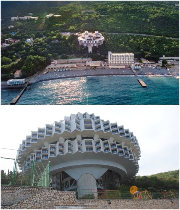 В 2011 году здание пансионата «Дружба» попало в ТОП-50 самых необычных зданий мира (Ялта). | Фото: tatlin.ru.