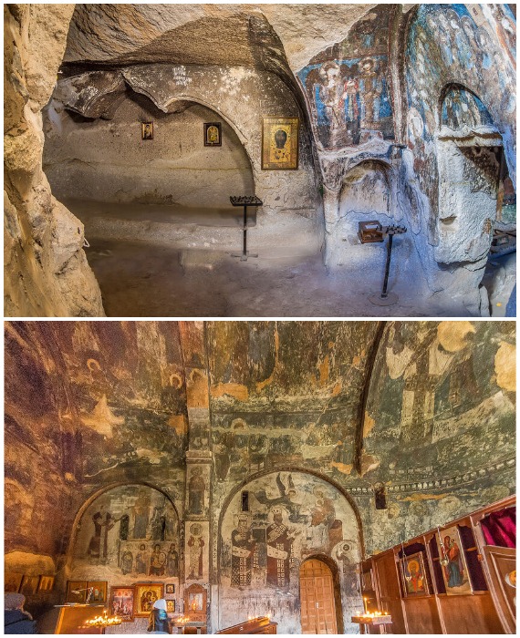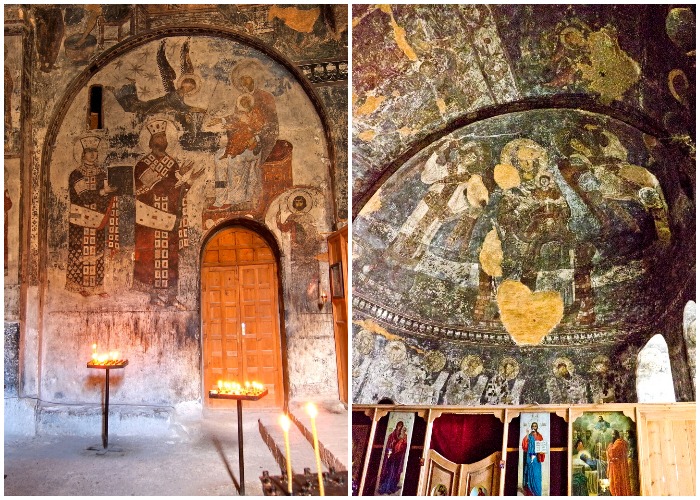 Толстый слой копоти в главном зале Храма Пресвятой Богородицы помог сохранить первоначальный вид фресок (Вардзиа, Грузия).