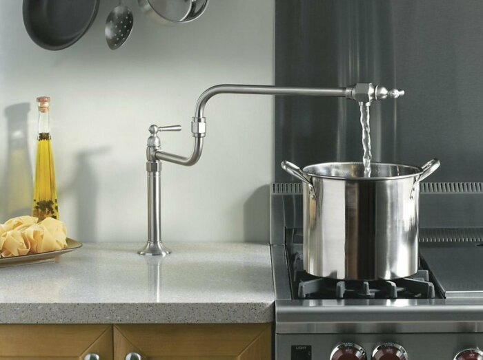Название данного приспособления говорит само за себя. По сути «Pot-Filler» — это кухонный кран над поверхностью плиты для готовки. Обычно он соединения с проточным фильтром. Как правило наполнитель кастрюль состоит из нескольких трубок и может складываться таким образом, чтобы почти вплотную прилегать к стене. Просто и удобно! С наполнителем хозяйке больше не понадобится каждый раз таскать от кухонной раковины к плите тяжеленую кастрюлю с водой.
