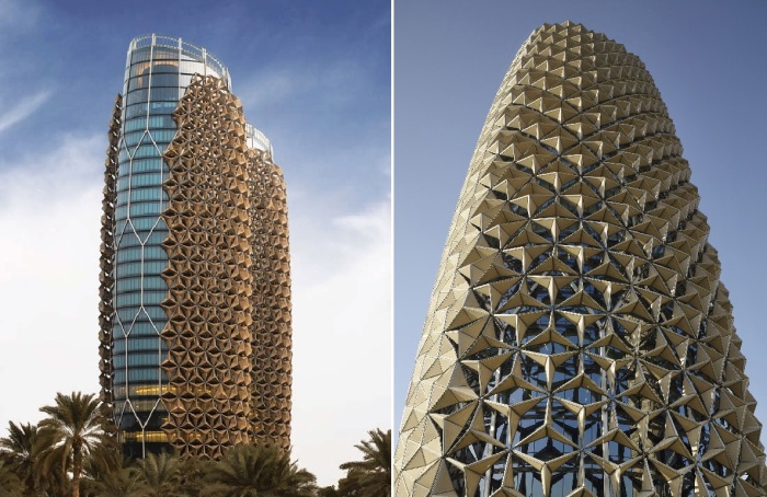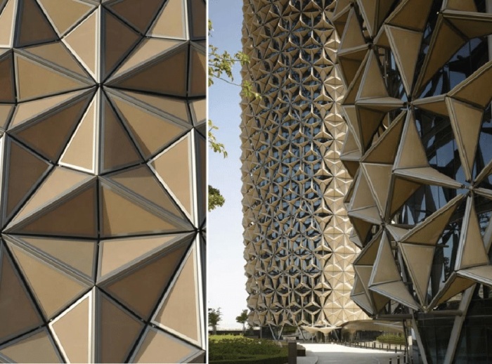 Инновационный затеняющий фасад создан из покрытых стекловолокном треугольников, приводимых в действие линейным приводом, запрограммированным реагировать на движение солнца (Al Bahar Towers, Абу-Даби). План башен основан на шести тангенциальных дугах, взятых из трех пересекающихся кругов, которые и образуют узор, являющийся эталоном почти всех геометрических конфигураций, известных в регионе. А если к этому прибавить, эффектные формы конструкции ультрасовременной машрабии, которая использовалась для образования инновационного фасада, «обученного» раскрывать и закрывать «лепестки», то с задачей эстетической привлекательности зданий разработчики справились на ура.